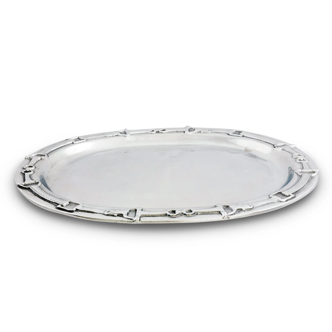 Pay tribute to the track with this Equestrian Oval Platter from Arthur Court. Bits race around the edge of this dish like the horses that wear them. Leathery straps wrap around the rein rings before fastening the riding instruments together in a continuous lap of movement.