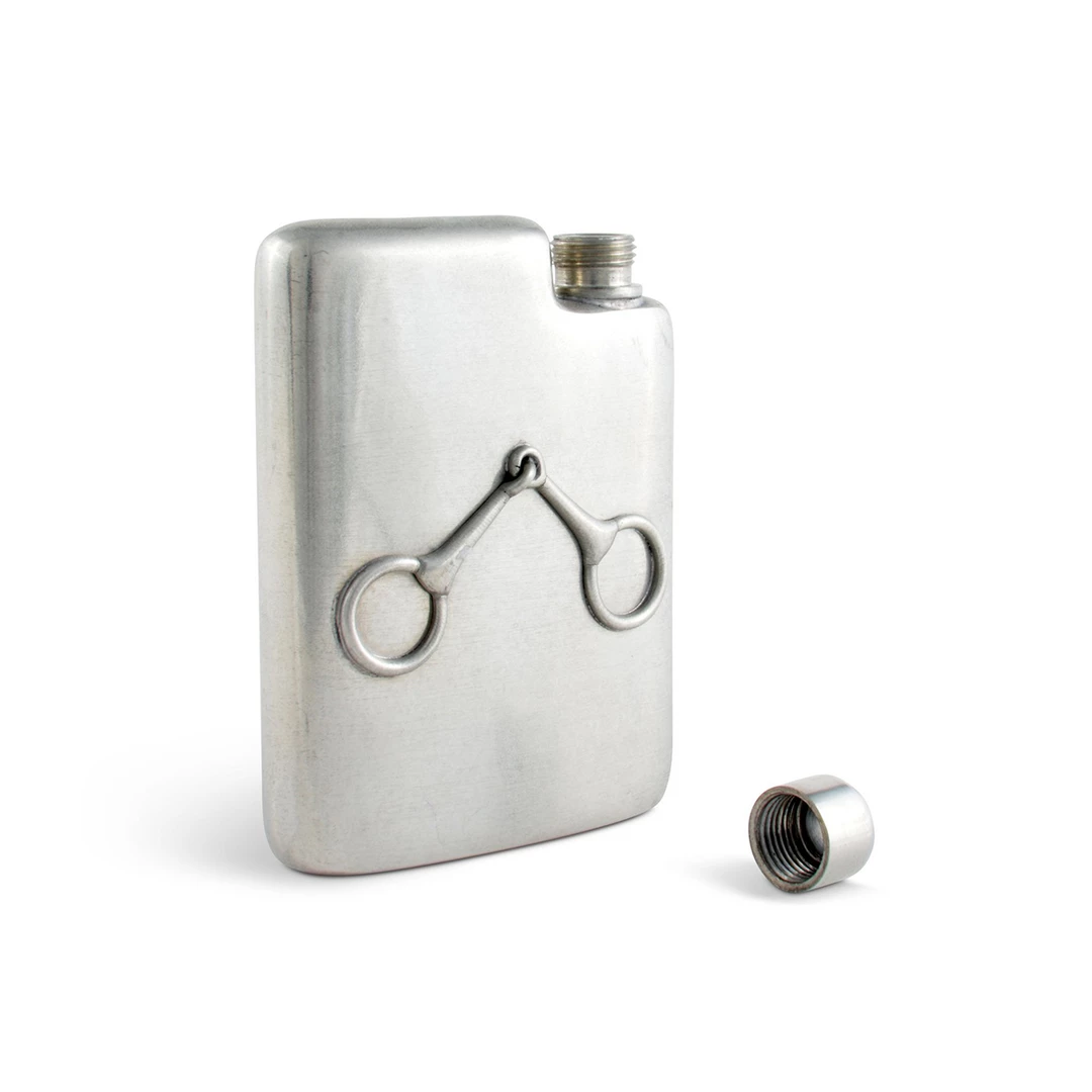 Long days on the trail are set right when you have a wee nip of your favorite drink in your pocket. Ride and drink in style with our O ring snaffle bit embellished, pewter hip flask.Β The smooth curved design is attractive and pocket-friendly, and the beauty of the pewter is evident at first glance.Β Perfect as a gift to your favorite equestrian,Β its excellent build qualityΒ andΒ great designΒ are deeply appreciated by the horsey set. Our quality flasks will last a lifetime and you may even pass one down to your kids.Β Β