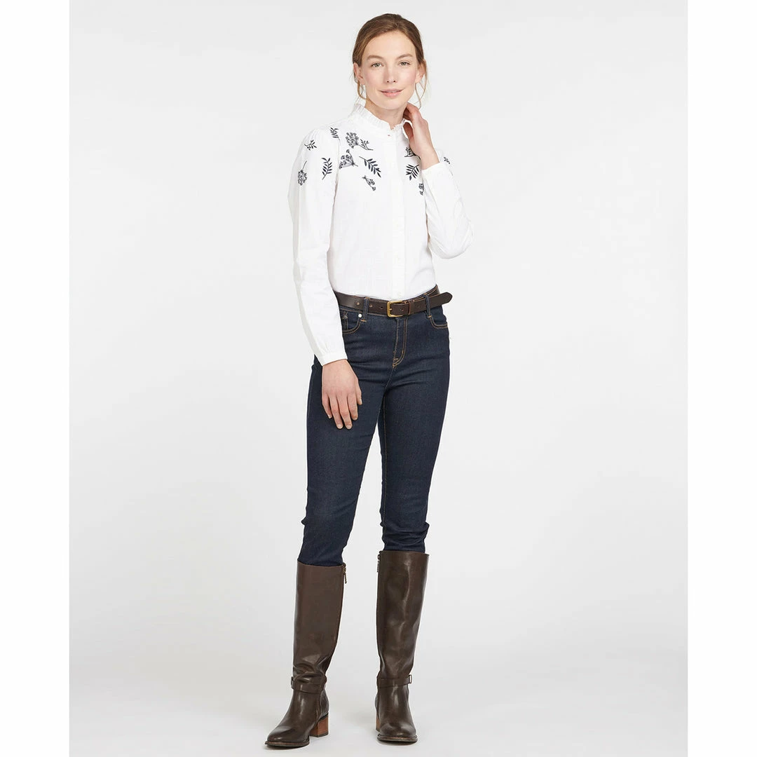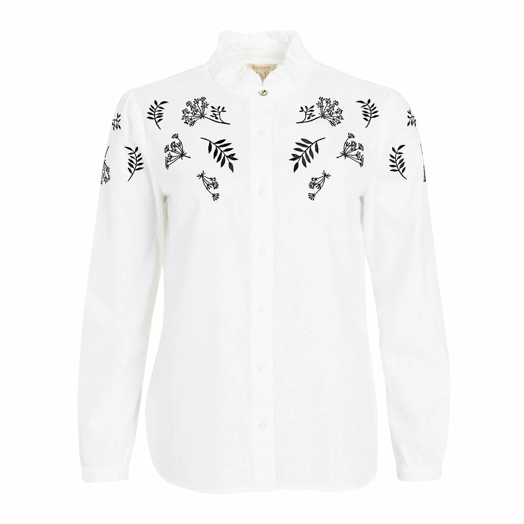 Add subtle femininity to any outfit with the Barbour Whernside shirt. Styled with ruffle detailing to the collar and scattered embroidery across the chest and sleeves, the Whernside shirt is easily styled for walks in the country. Branded buttons to the front and cuffs add impeccable attention to detail while a Barbour ID badge to the back of the neck subtly finishes the garment.