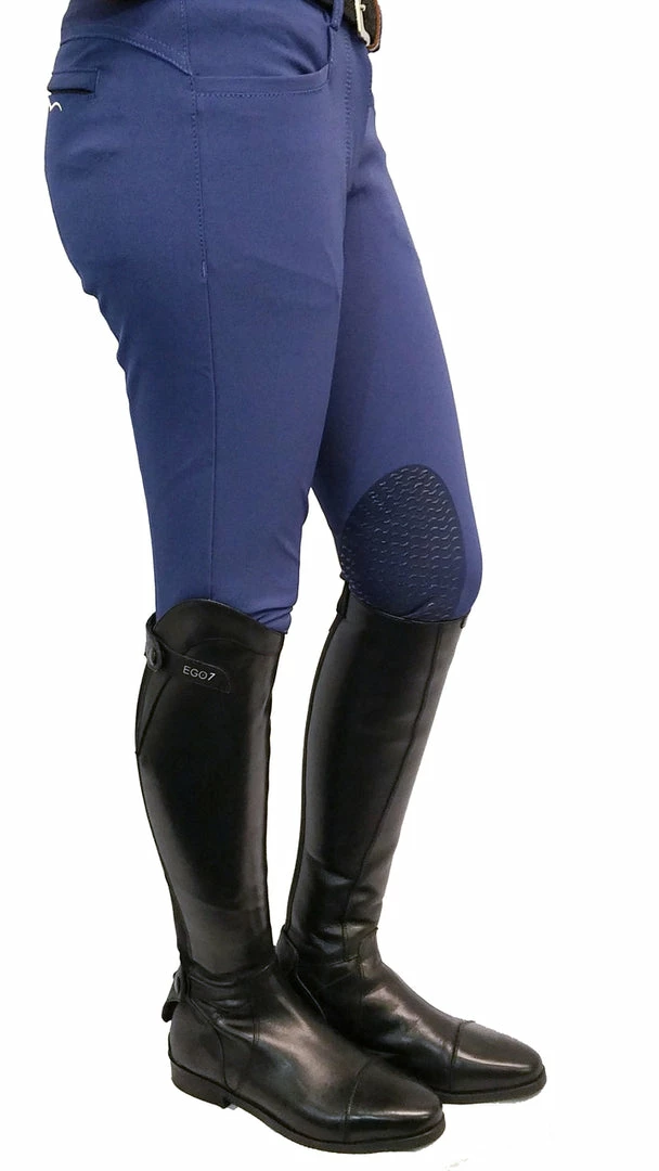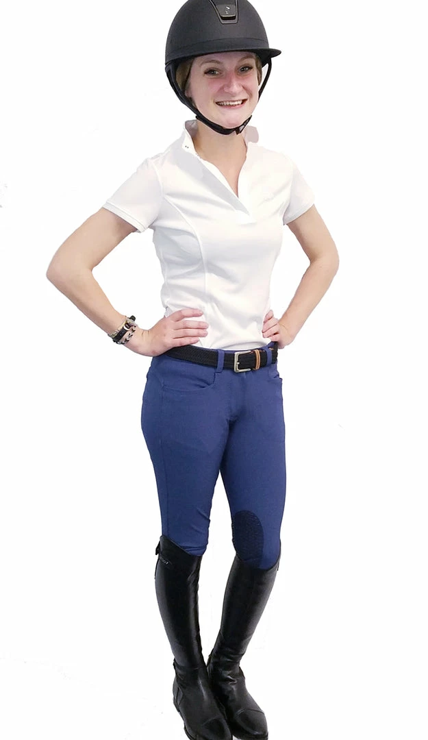 This women’s low-rise breech is outlined with decorative stitching, and the low-profile back pockets are accentuated with a cute flower-like button.
