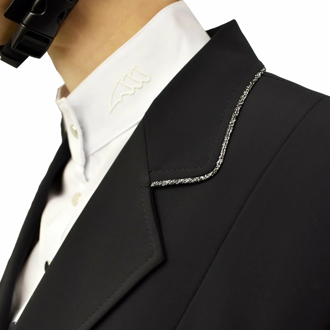 Womenβs show coat with XCOOL fabric and tailored construction. Details include metal buttons and Silver/Black piping on collar and backside.