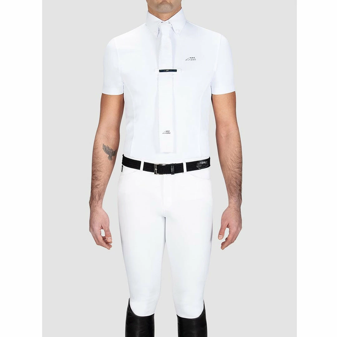 We love the Menβs Vick Short Sleeve Show Shirt because it was designed for the equestrian athlete. This shirt is made with Equilineβs X-Premium technical fabric, which will keep you cool and comfortable during your ride. Breathable and elasticized with a button-down collar in white poplin. The VICK also features a removable rubber clasp to keep your tie in place.