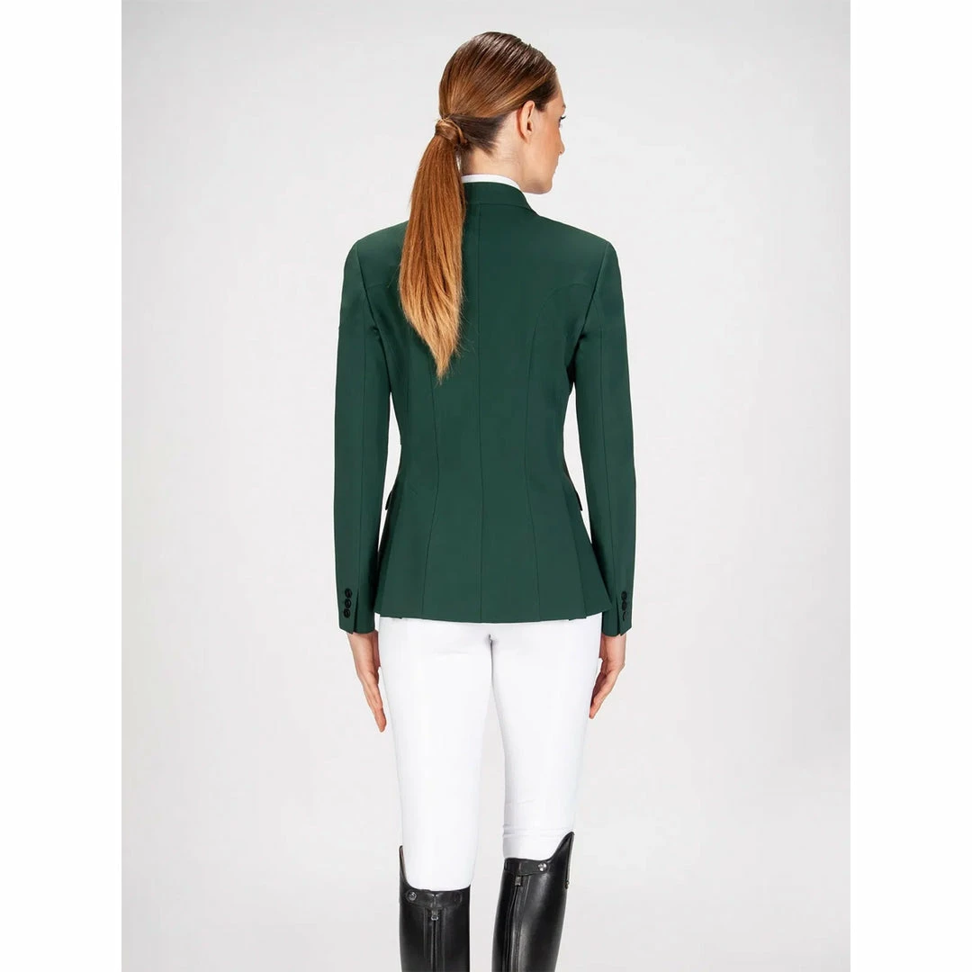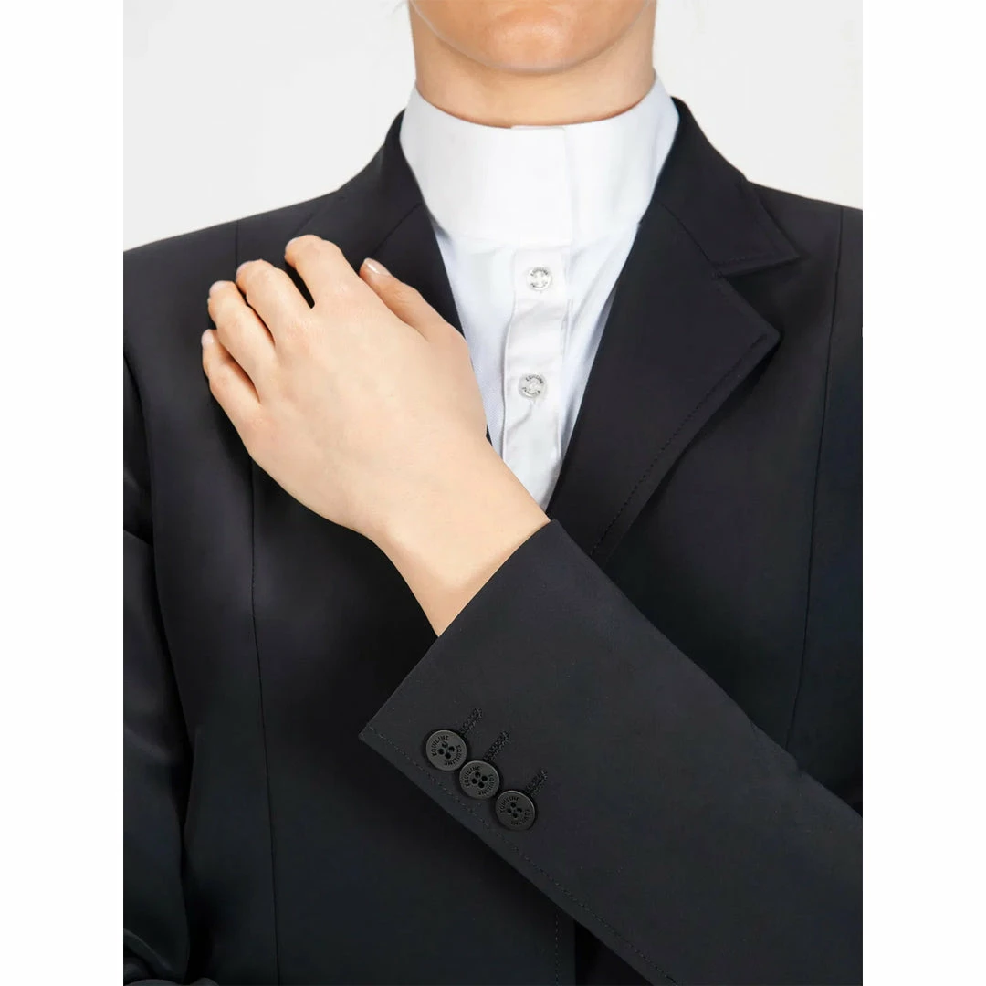 We love the Equiline Women’s Hayley Hunter Show Coat because it is traditionally styled for the Hunter and Equitation show ring.Β The coat is cut slightly longer than a standard competition jumping jacket and is tailored for a very flattering fit.Β The coat boasts Equilineβs proprietary X-Cool Evo 4-way stretch fabric, which allows for enhanced breathability and freedom of movement. The lightweight feel makes it ideal for equestrians competing in hot weather climates. Additional features include discreet branding, a double vent in the back, faux flap pockets in the front, and flat matte buttons.