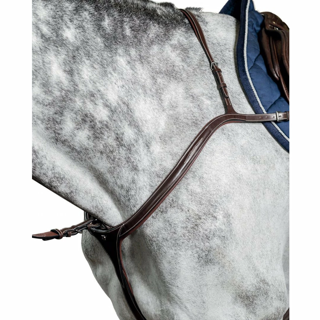Anatomic Long Bridge breastplate, with ridge profiling and fancy stitching. The anatomic design and soft padding help to improve comfort for the horse by more evenly distributing pressure. Features elastic along with the buckles and a running martingale with snap rings (EVO) included.
