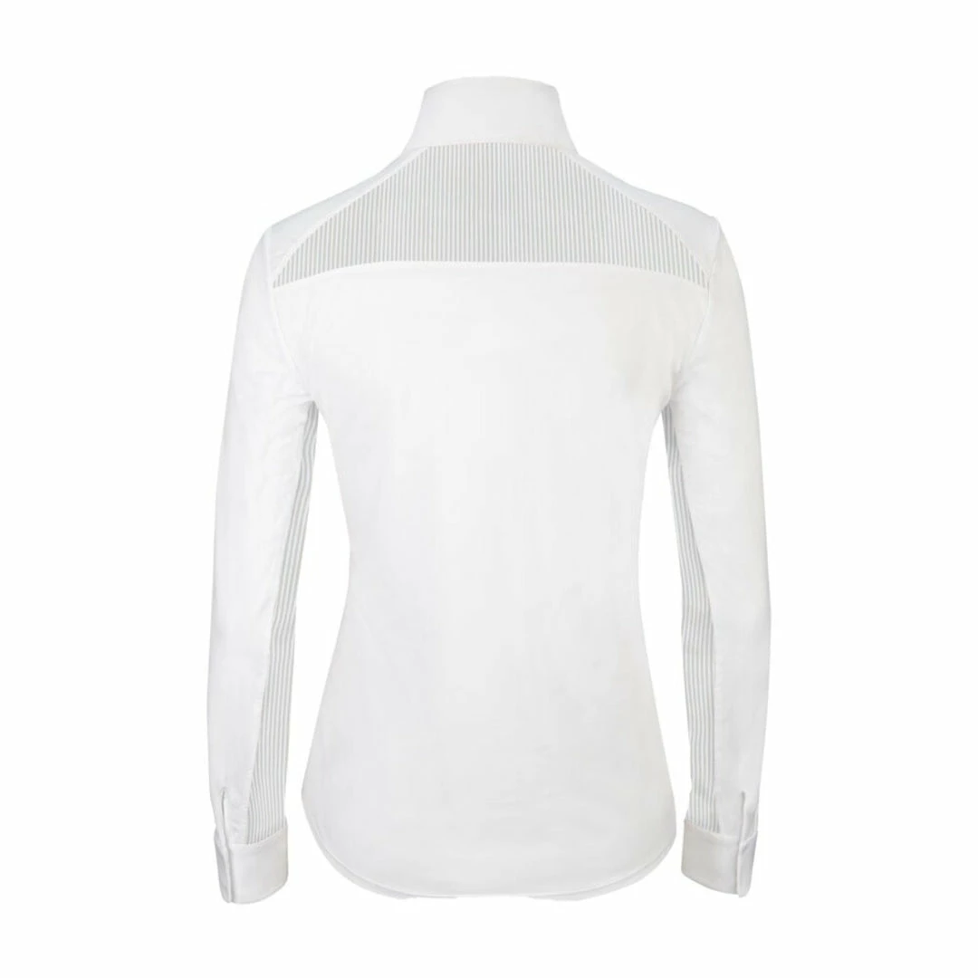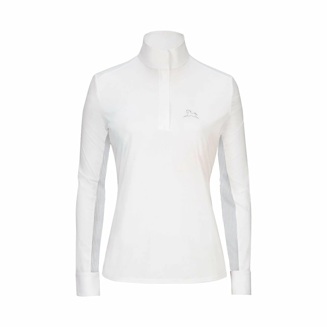 The Carly shirt will be the perfect addition to your show clothing wardrobe with its unique mesh back and underarm panels and cutting-edge technology. The fabric features 37.5® patented thermoregulation technology which has proven to help your body manage its core temperature and therefore, increase stamina. It keeps you comfortable by helping your body to maintain an optimum core temperature of 37.5° Celsius (99.5° Fahrenheit) which is ideal for peak athletic performance. The particles are naturally derived and work for the life of the product (it will never wash out!). The zipper placket with snap collar modernizes this traditional look.
