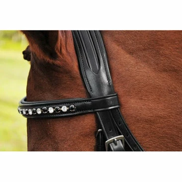 The Cadence Dressage Bridle exudes elegance, with it’s subtly shaped noseband and classic Black and Clear crystal browband. The Cadence features a modernized threaded headstall, padded contoured and lined for easier adjustment over the poll; with 5/8″ cheek pieces. The soft padded flash crank noseband measures 1 1/2″ at its widest and gently tapers down to 1 3/8″ on each side. This bridle is made of the finest Grade A English Sedgewick’s leather. All hardware is stainless steel, buckle end, with a roller buckle on the noseband.