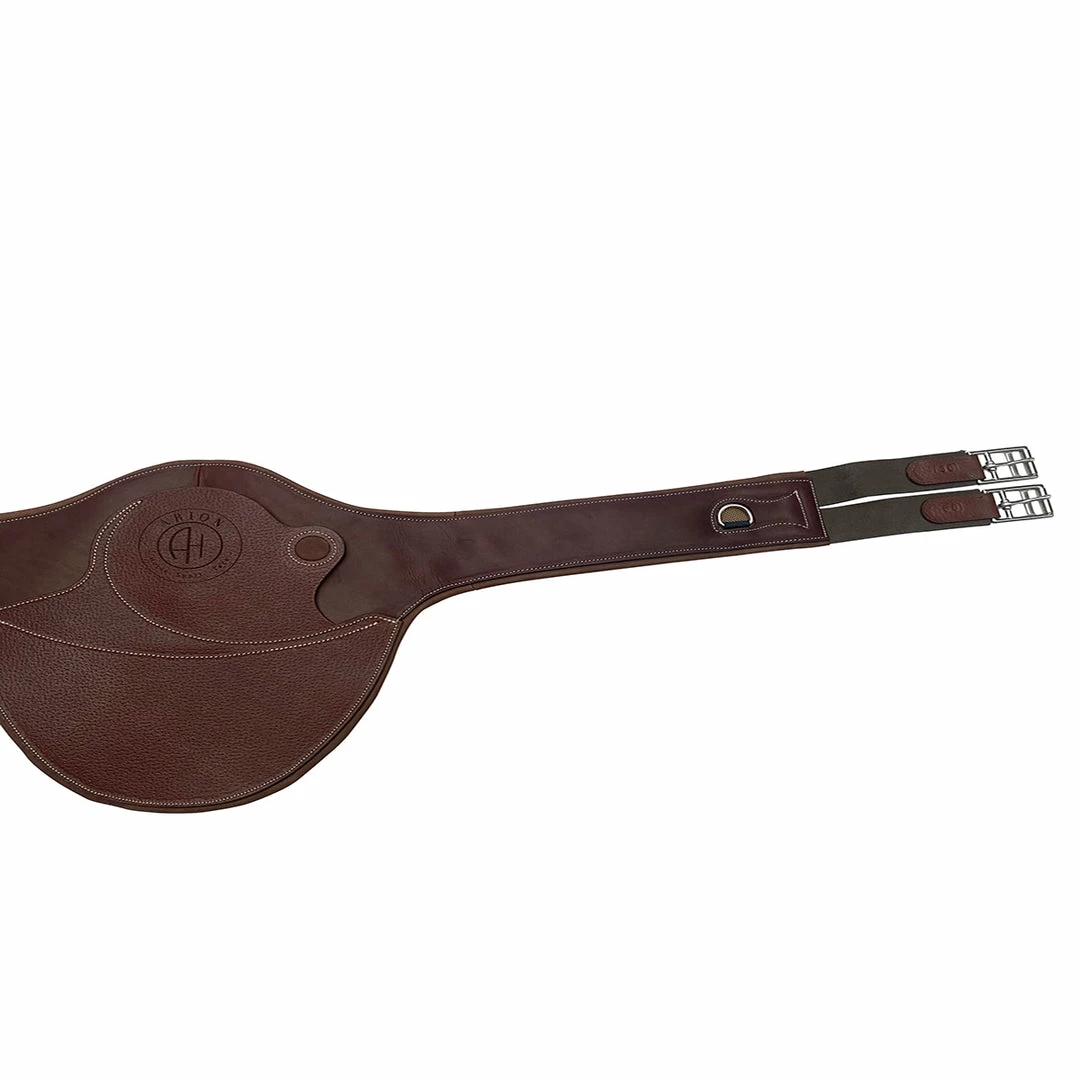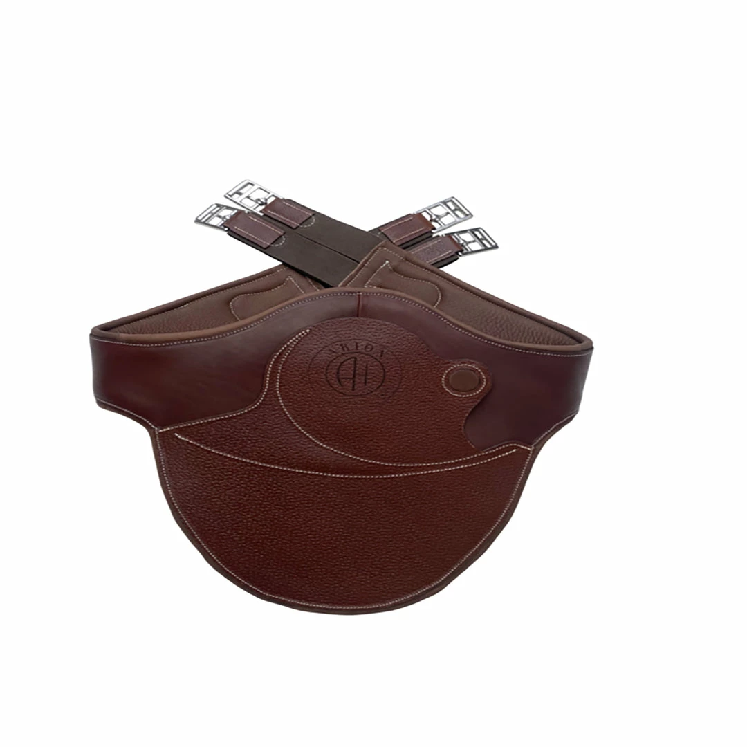 Our Long Anatomic Belly Guard Girth is made of 100% vegetable tanned French leather and lined with breathable neoprene padding for security and grip. The unique center carabiner clip system uses a leather cover that snaps opens and closed over the clip, eliminating the chance for a horse to catch a shoe in the girth.